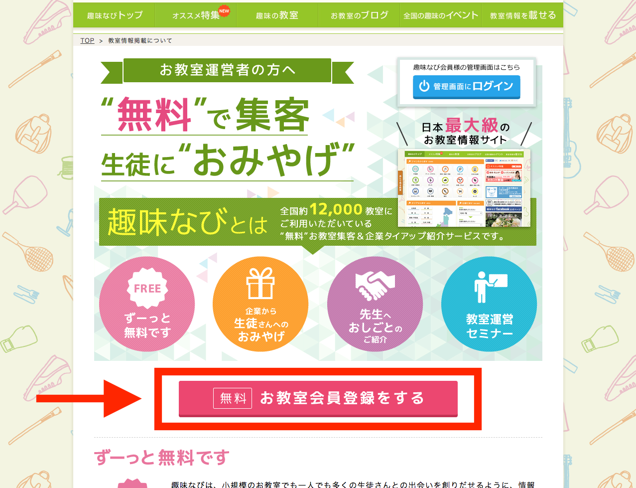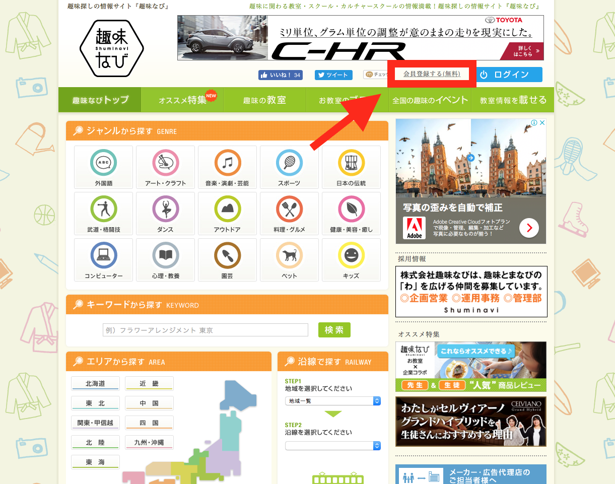 1. 趣味なびのサイトへいき、「会員登録する(無料)」をクリックします。