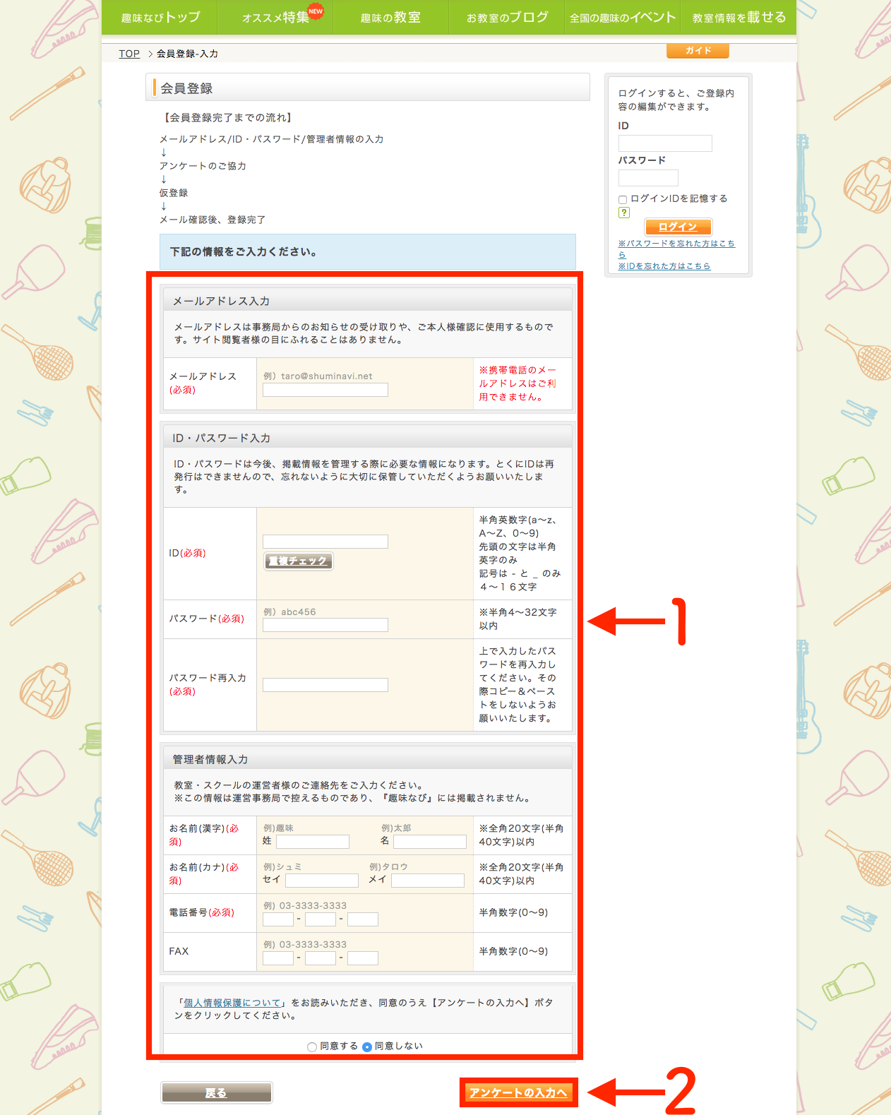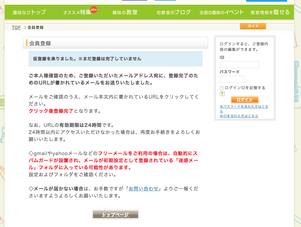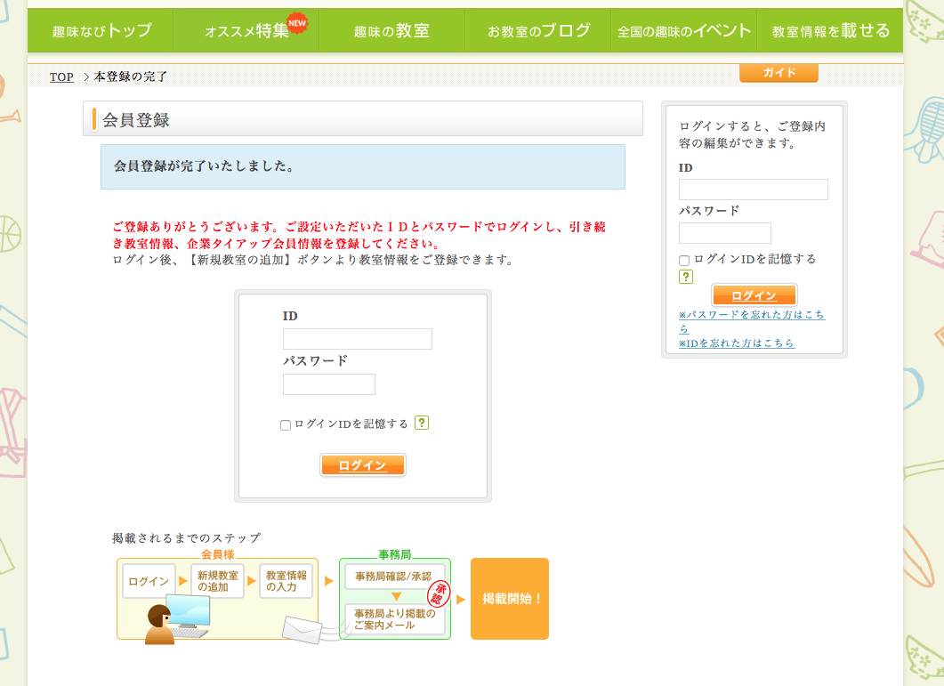 これで会員登録は完了です。次回より、IDとパスワードを入力して、趣味なびの自分のアカウントへログインし、教室の設定を行っていけます。