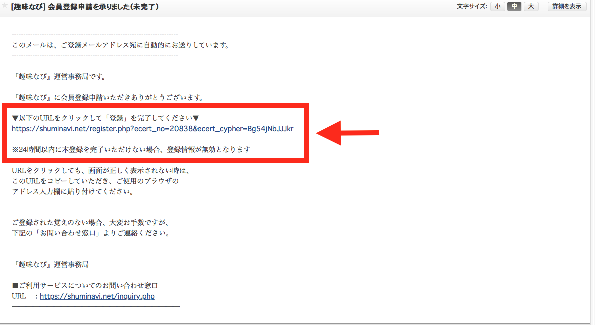 6. 趣味なびから届いているメールを開き、下図の赤枠の部分のリンクをクリックします。
