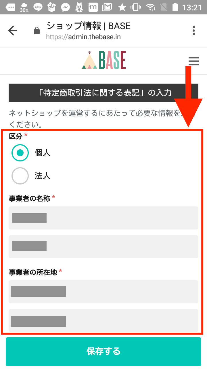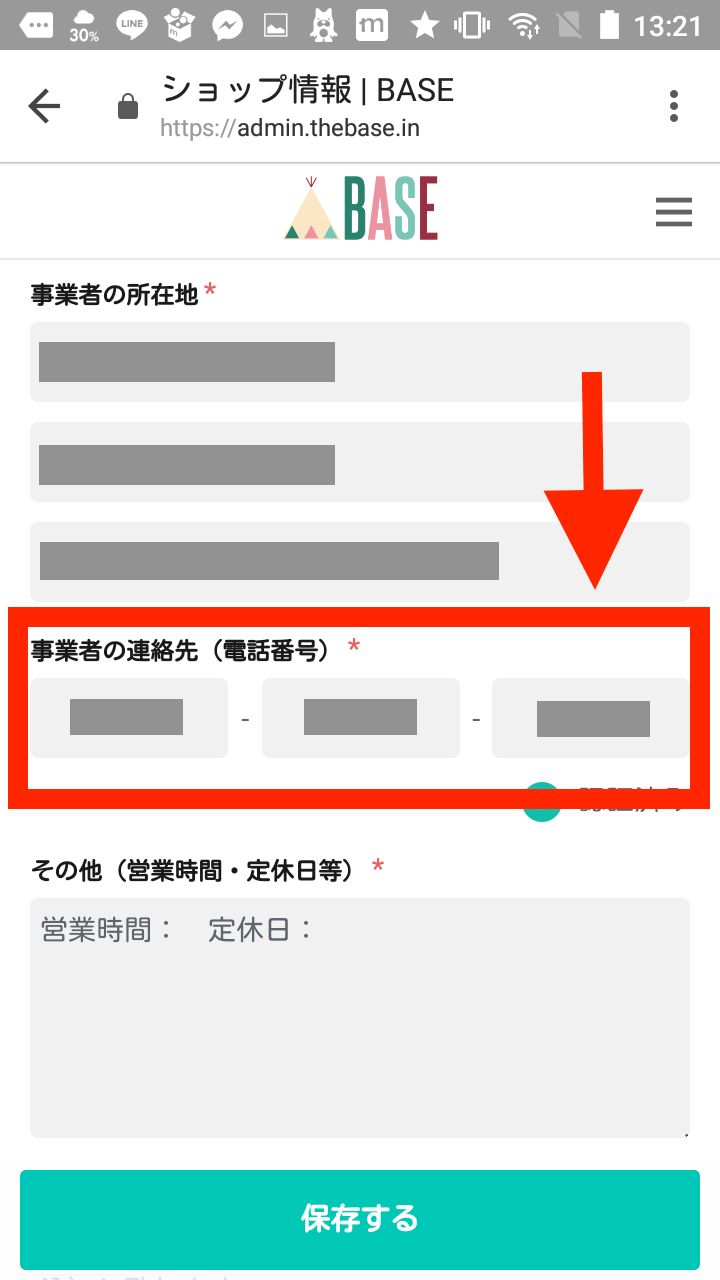 そのまま画面を下に移動させ、「事業者の連絡先(電話番号)」を入力していきます。