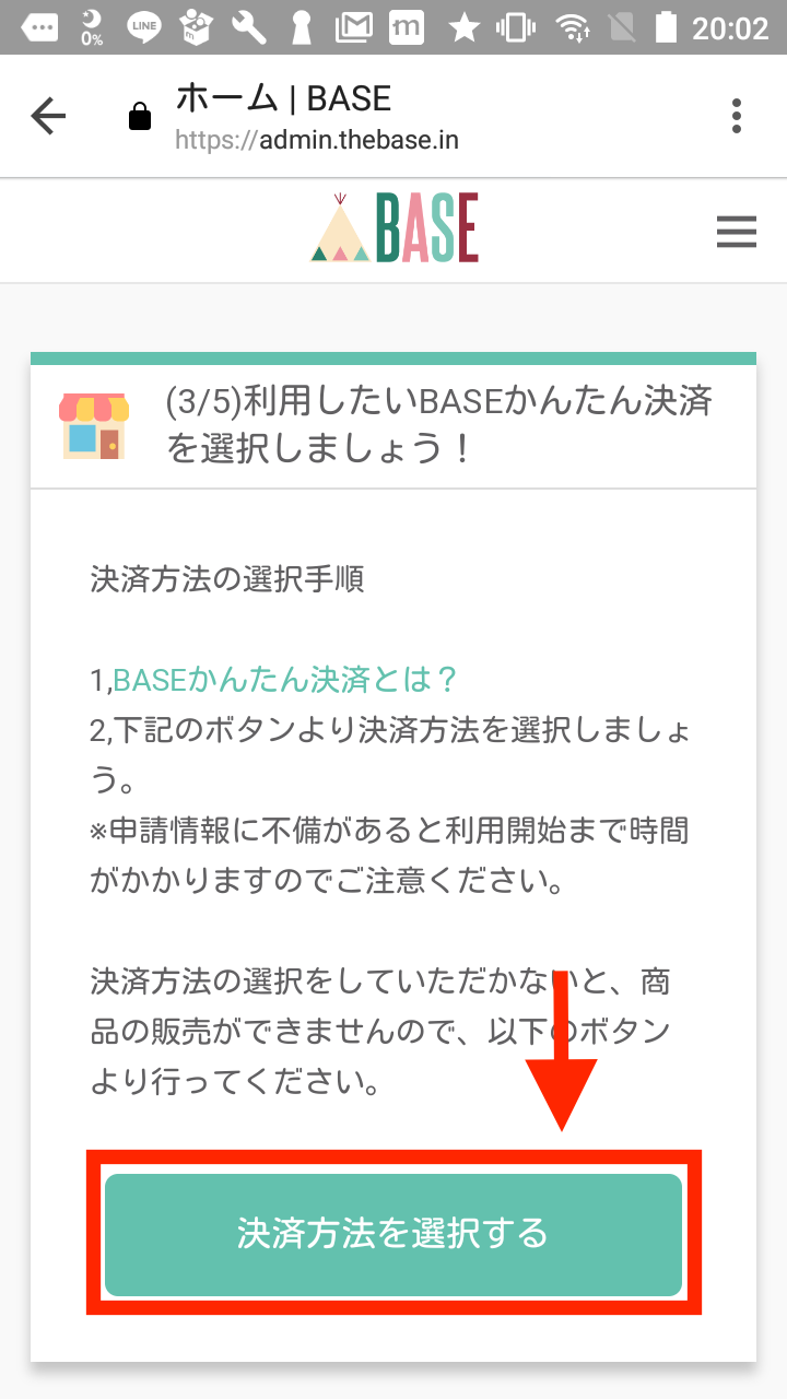 15. 「(3/5)利用したいBASEかんたん決済を選択しましょう!」という画面に移動しますので、「決済方法を選択する」をクリックします。
