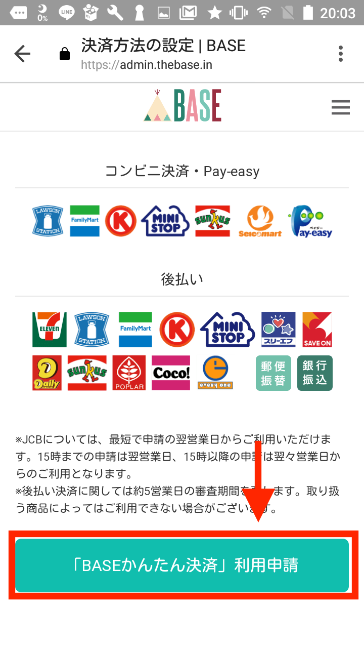 16. 「BASEかんたん決済利用申請」をクリックします。
