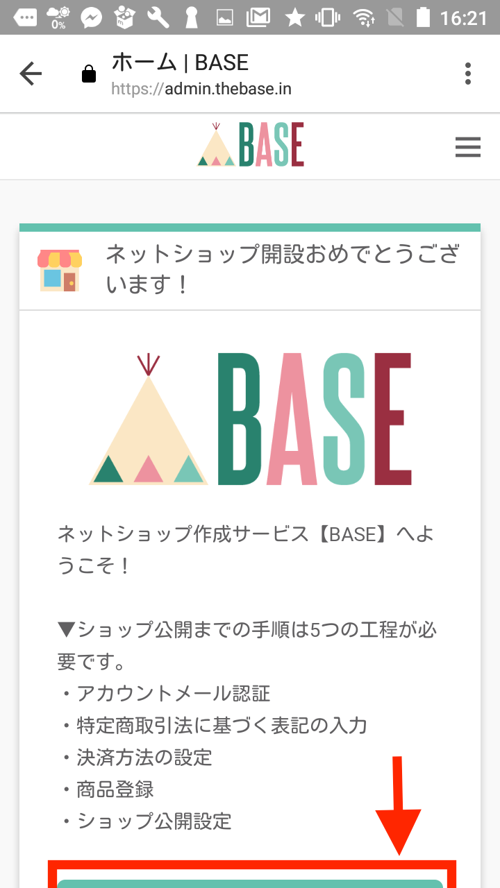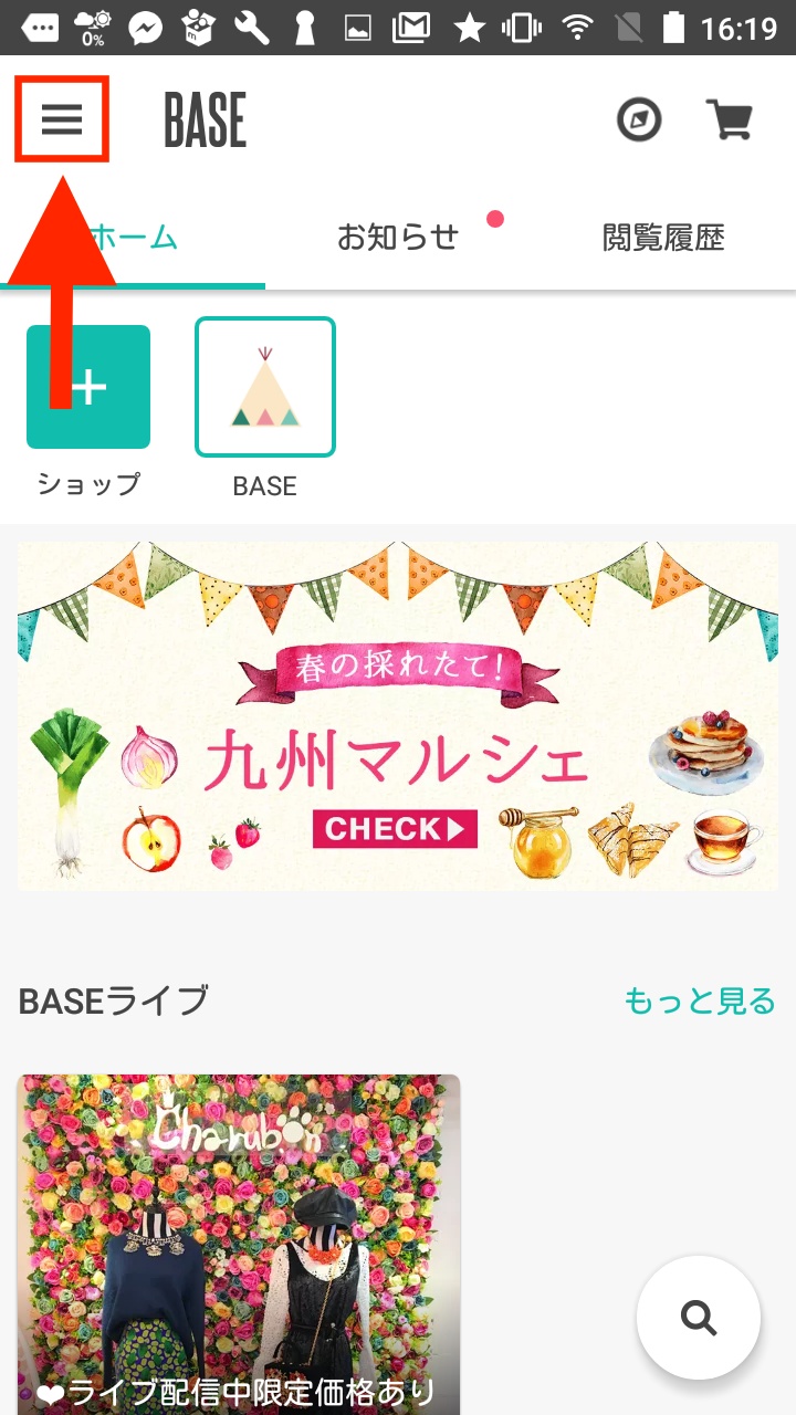 3.BASEのトップページへ移動します。移動したら、画面内にある赤枠の部分をクリックします。