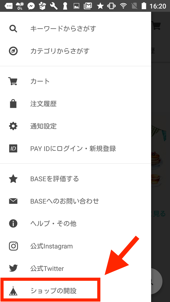 4. メニュー画面が出てきますので「ショップの開設」をクリックします。