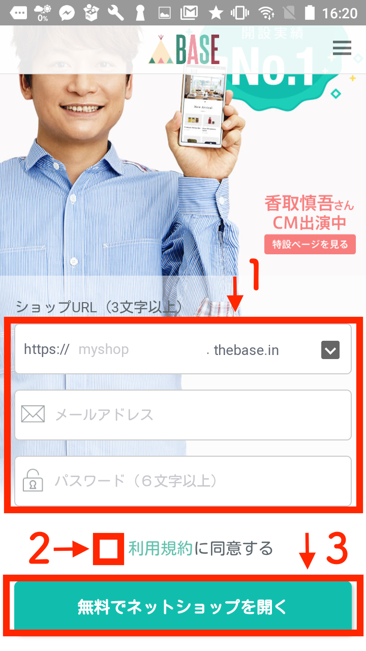 「利用規約」にチェックを入れ、最後に「無料でネットショップを開く」をクリックします。