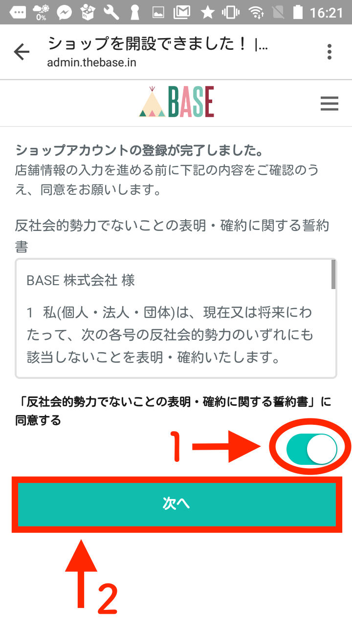 6. 「反社会的勢力ではないことの表明・契約に関する誓約書に同意する」にチェックを入れ、「次へ」をクリックします。
