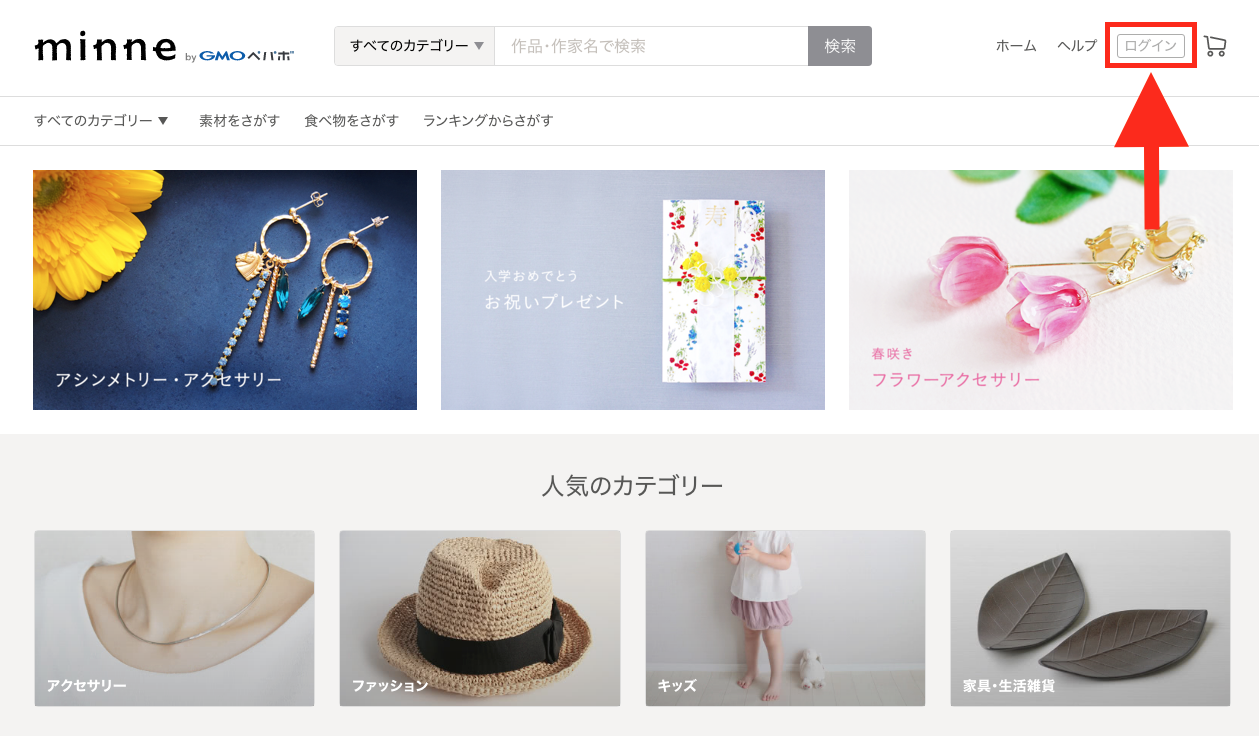 1.まずミンネminneのホームページへ移動、「ログイン」をクリックします。