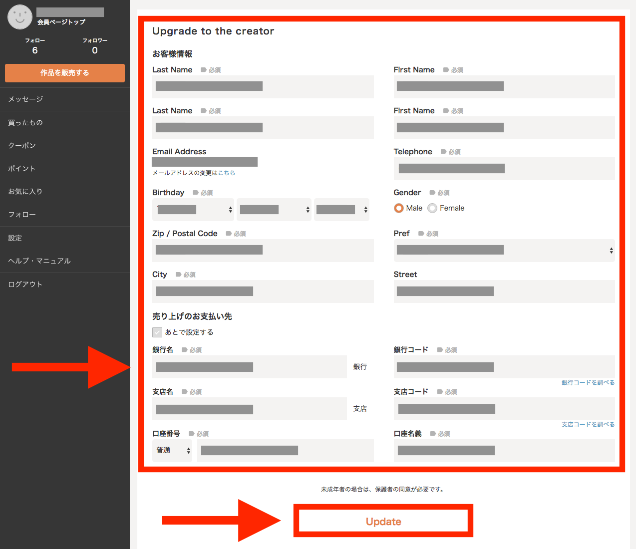 「売上のお支払先」欄に、売上金を受け取るための銀行口座の情報を入力します。