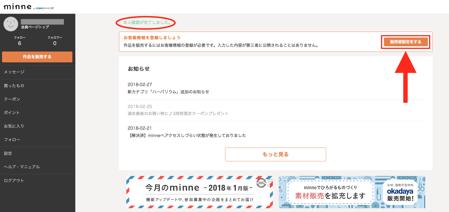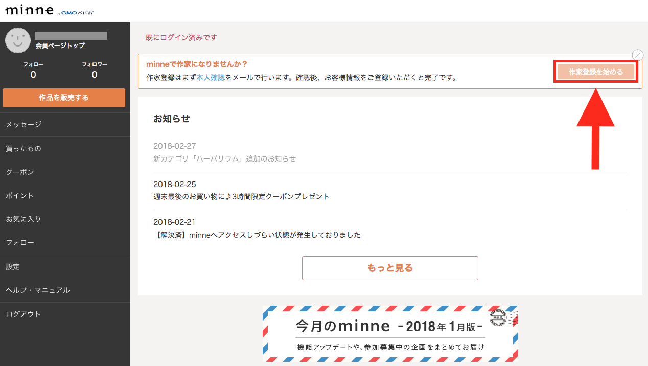 次は、あなたご自身が、「ハンドメイド作家」として、ミンネに登録します。