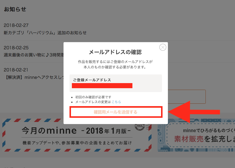 「minneのwebページをお使いの方はこちら」のリンクをクリックします。