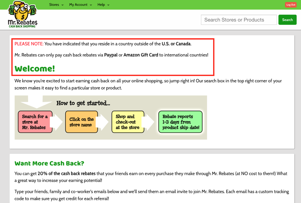 Mr.Rebates can only pay cash back rebates via Paypal or Amazon Gift Card to international countries!