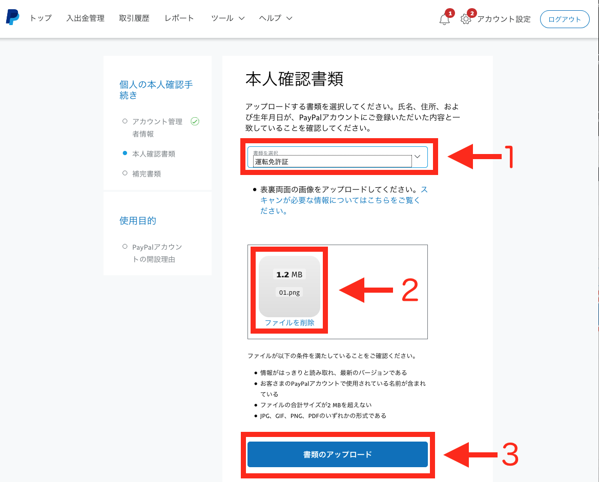 本人確認書類は、運転免許証、パスポート、住民基本台帳カード、健康保険証などから選べます。