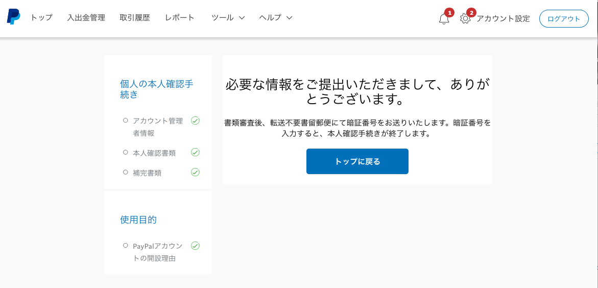 暗証番号をペイパルのサイトで入力し、本人確認手続きが完了となります。