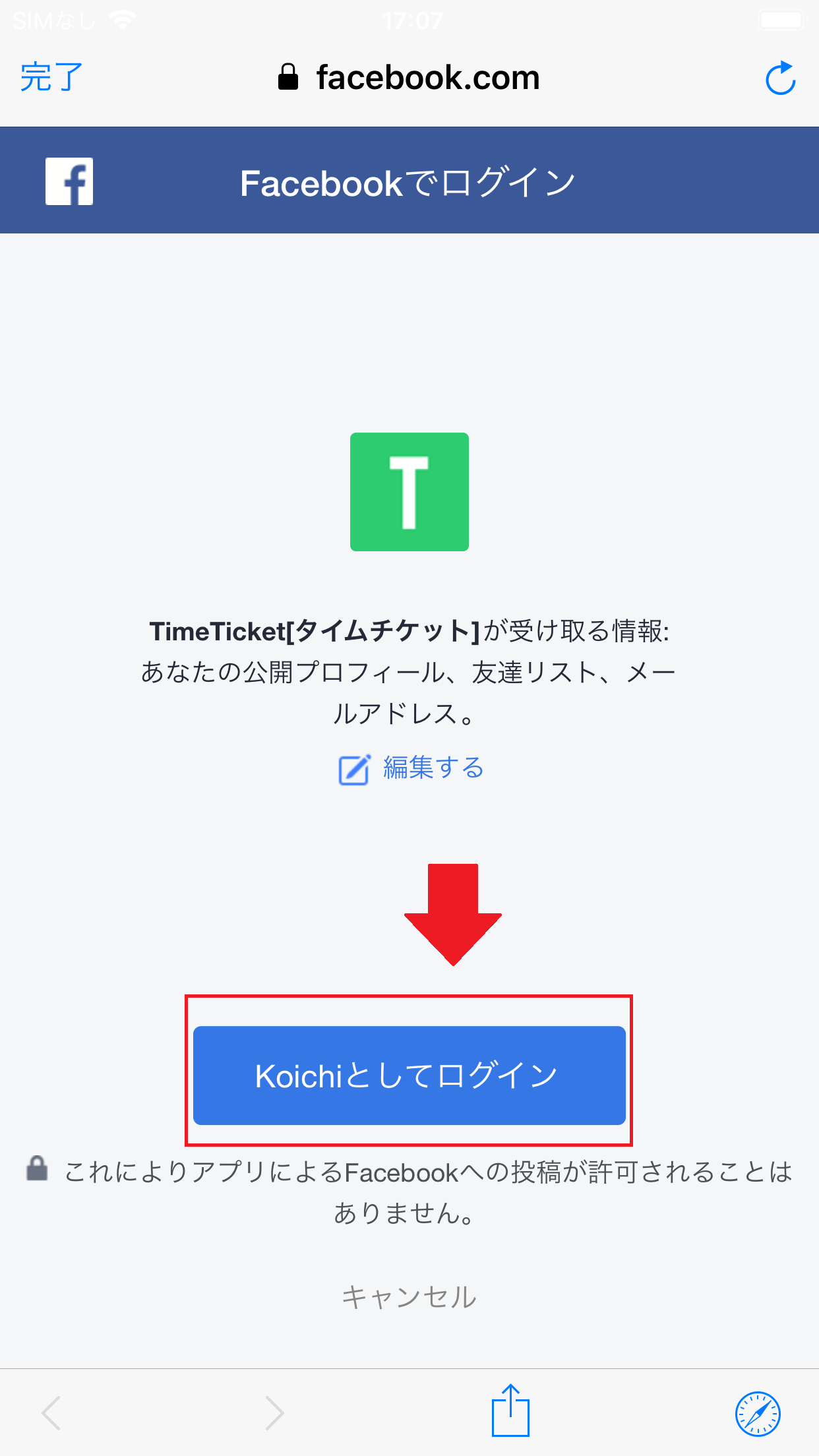 次の画面で「〇〇としてログイン」をタップします。
