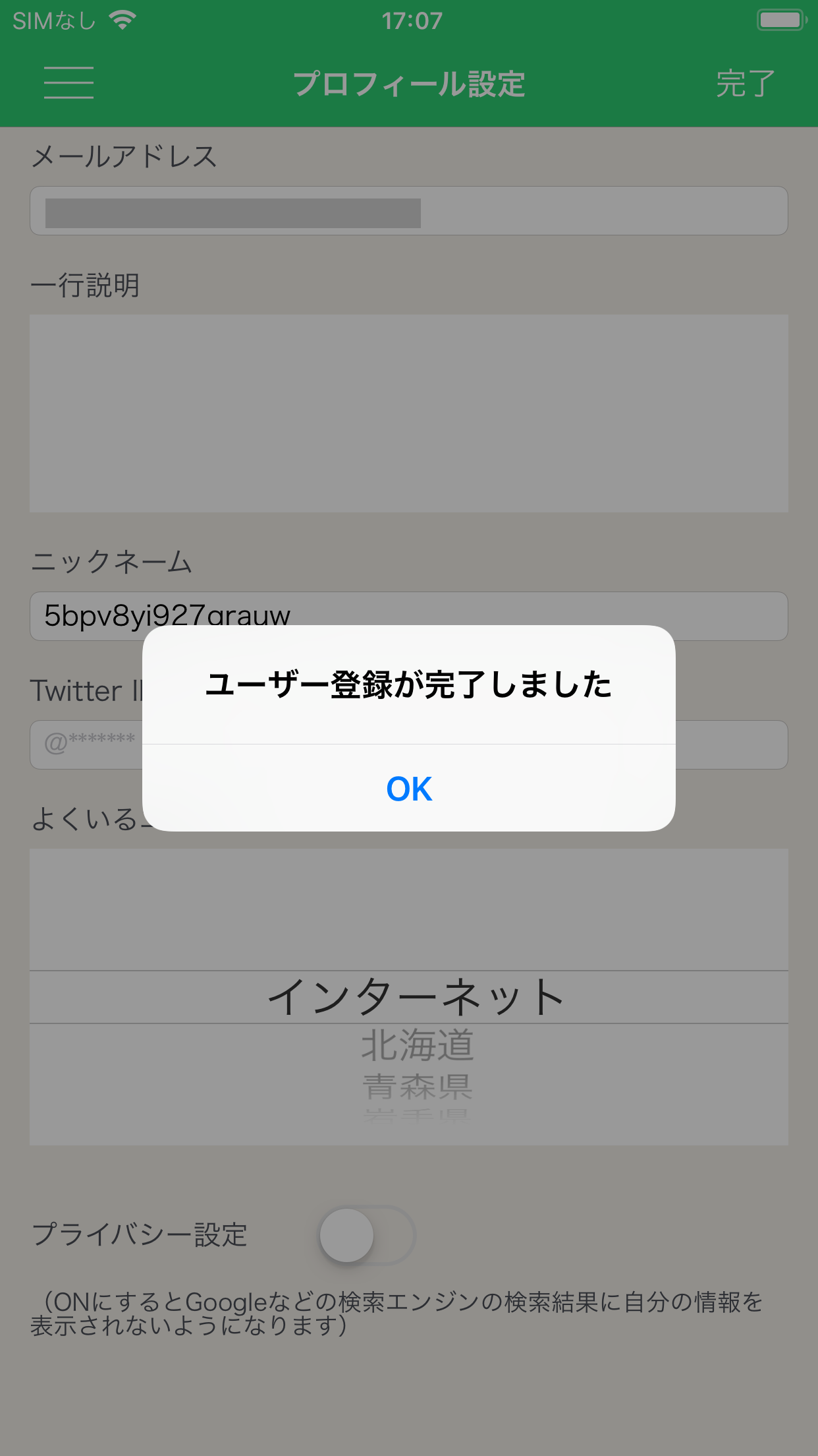 次の画面で「ユーザー登録が完了しました」と出るので「OK」をタップします。