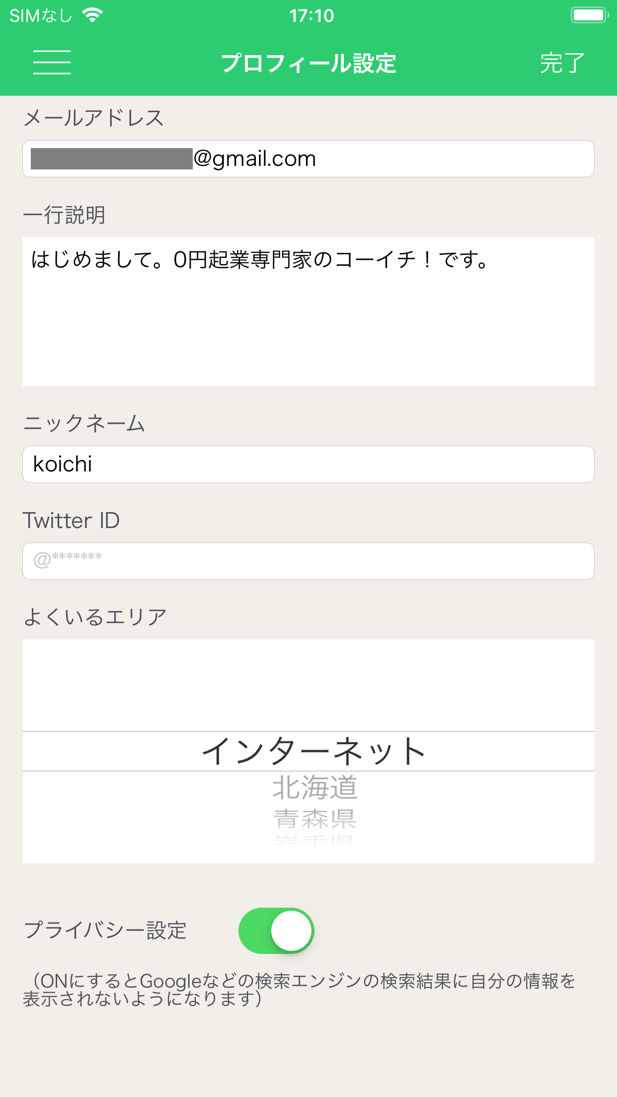 次の画面で、メールアドレス、ニックネームなど入力していきます。