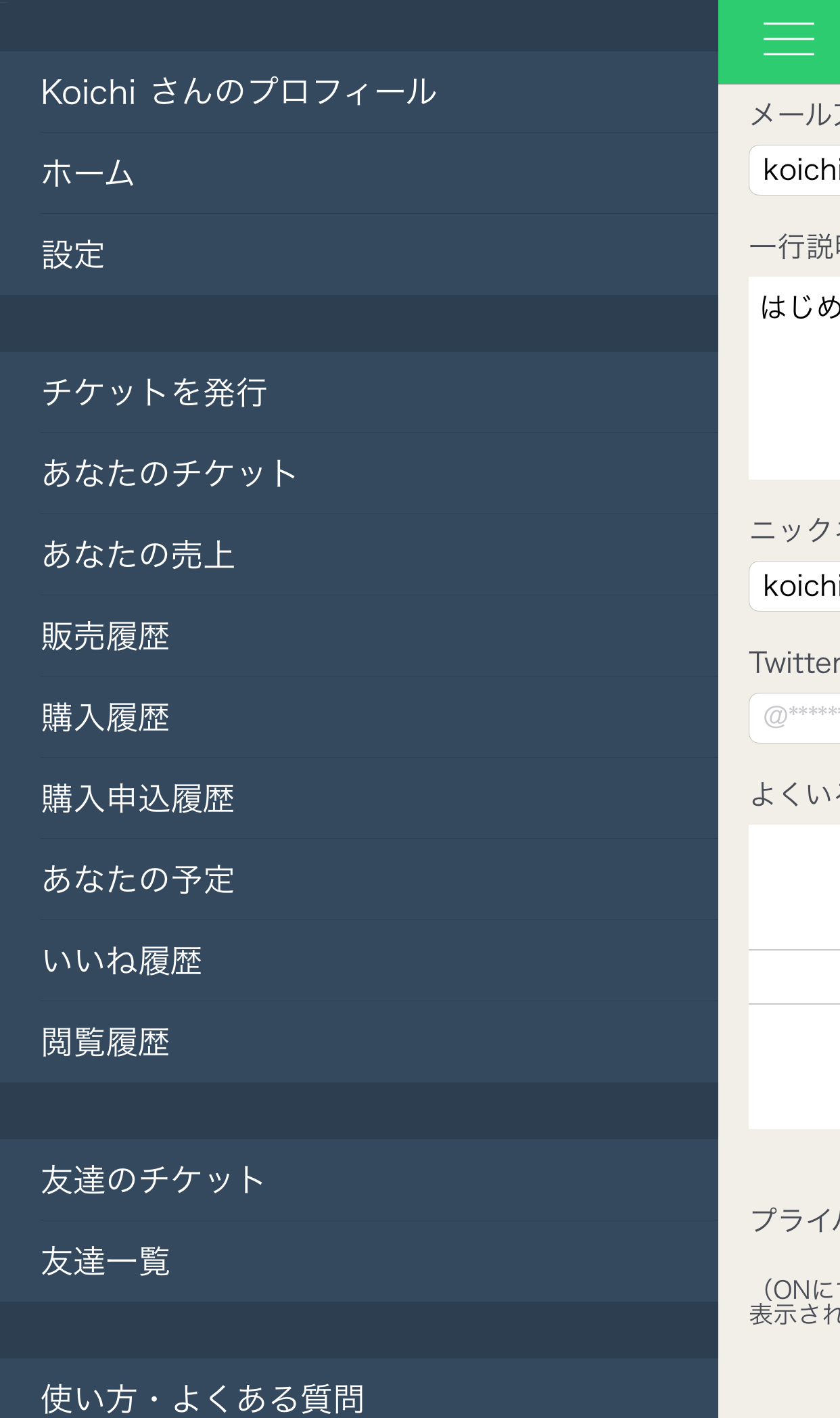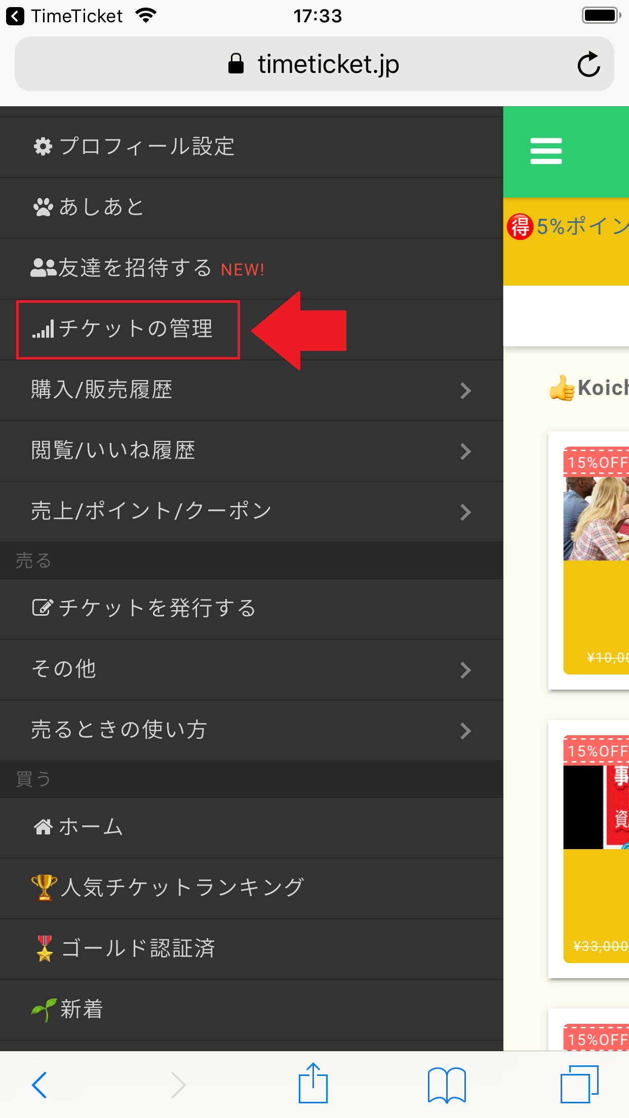 メニュー画面を開き「チケットの管理」をタップします。