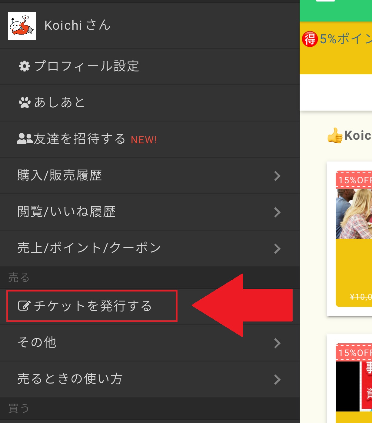メニューが出てきたら、「チケットを発行する」をクリックします。