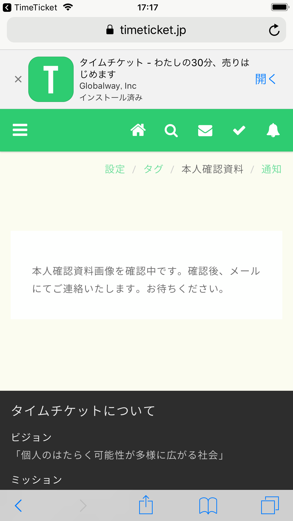 「本人確認資料の確認中です。確認後、メールにて連絡いたします」と表示されます。