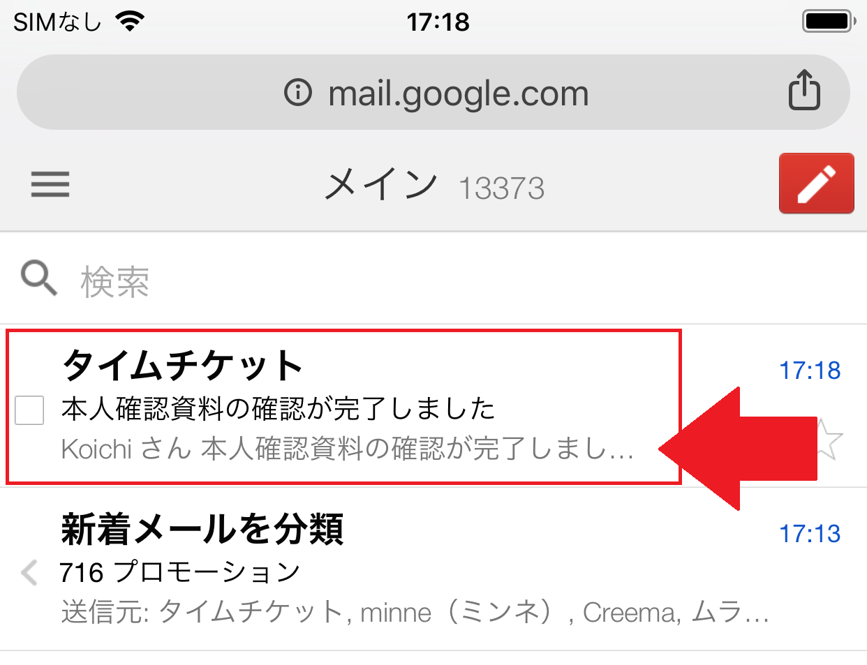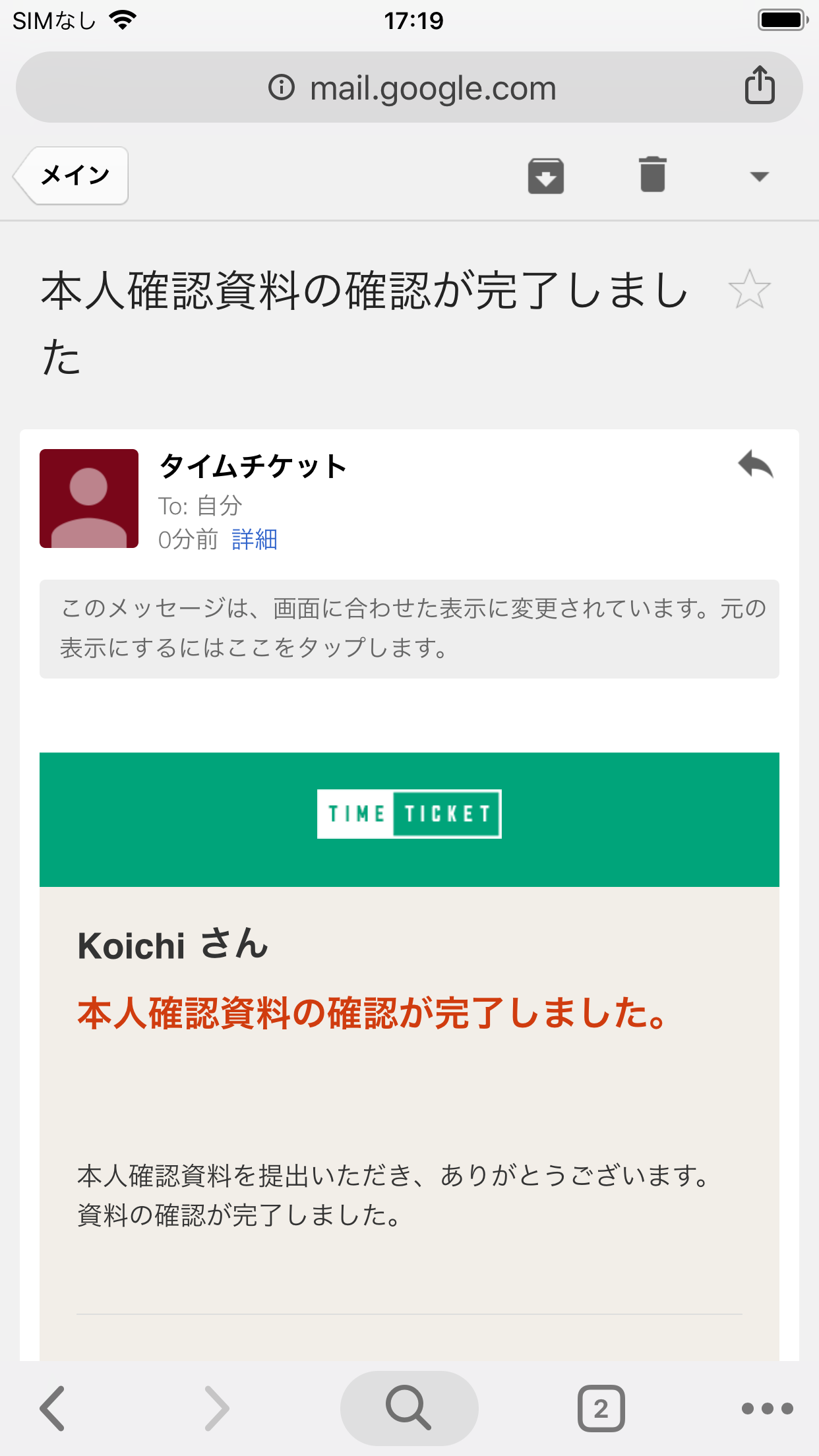 タイムチケットからメールが届いていることが確認できます。