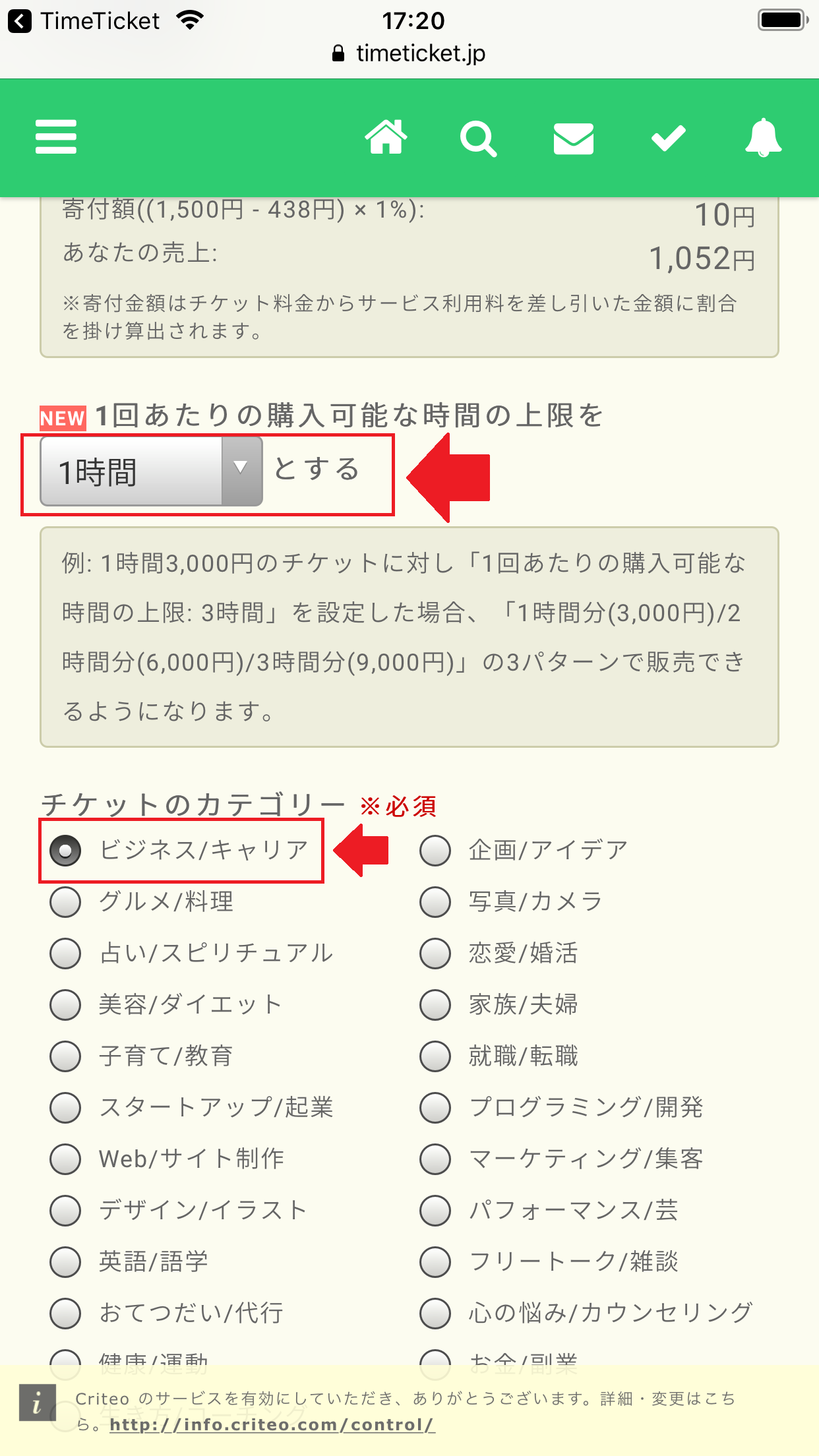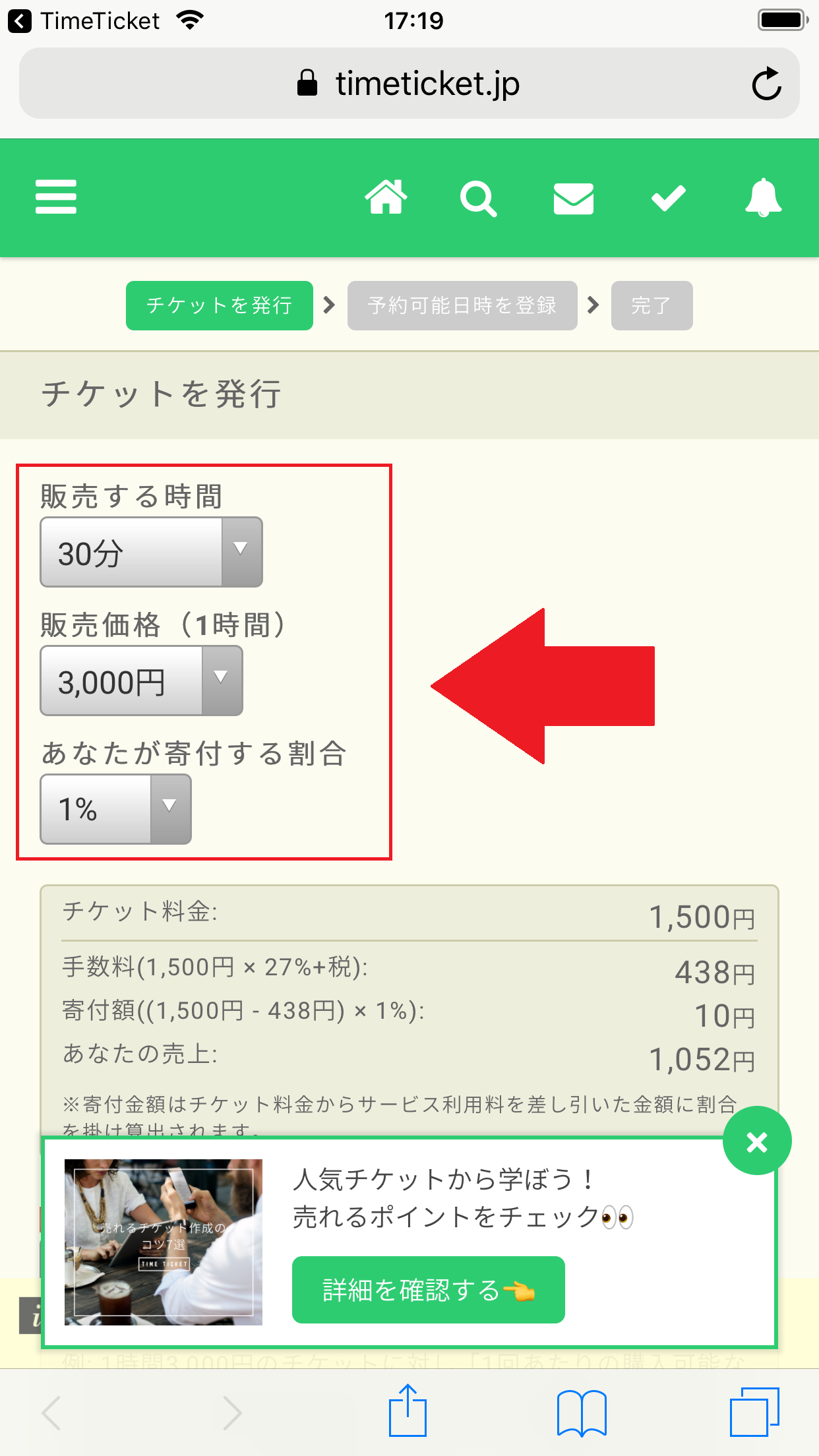 なお、タイムチケットでは、売り上げから最低1%は、社会へ寄付するような仕組みになっています。このパーセントは任意に設定できますが、最低1%は、必ず、寄付として貢献する必要があります。(その点を踏まえて、自分の金額設定をしてください)