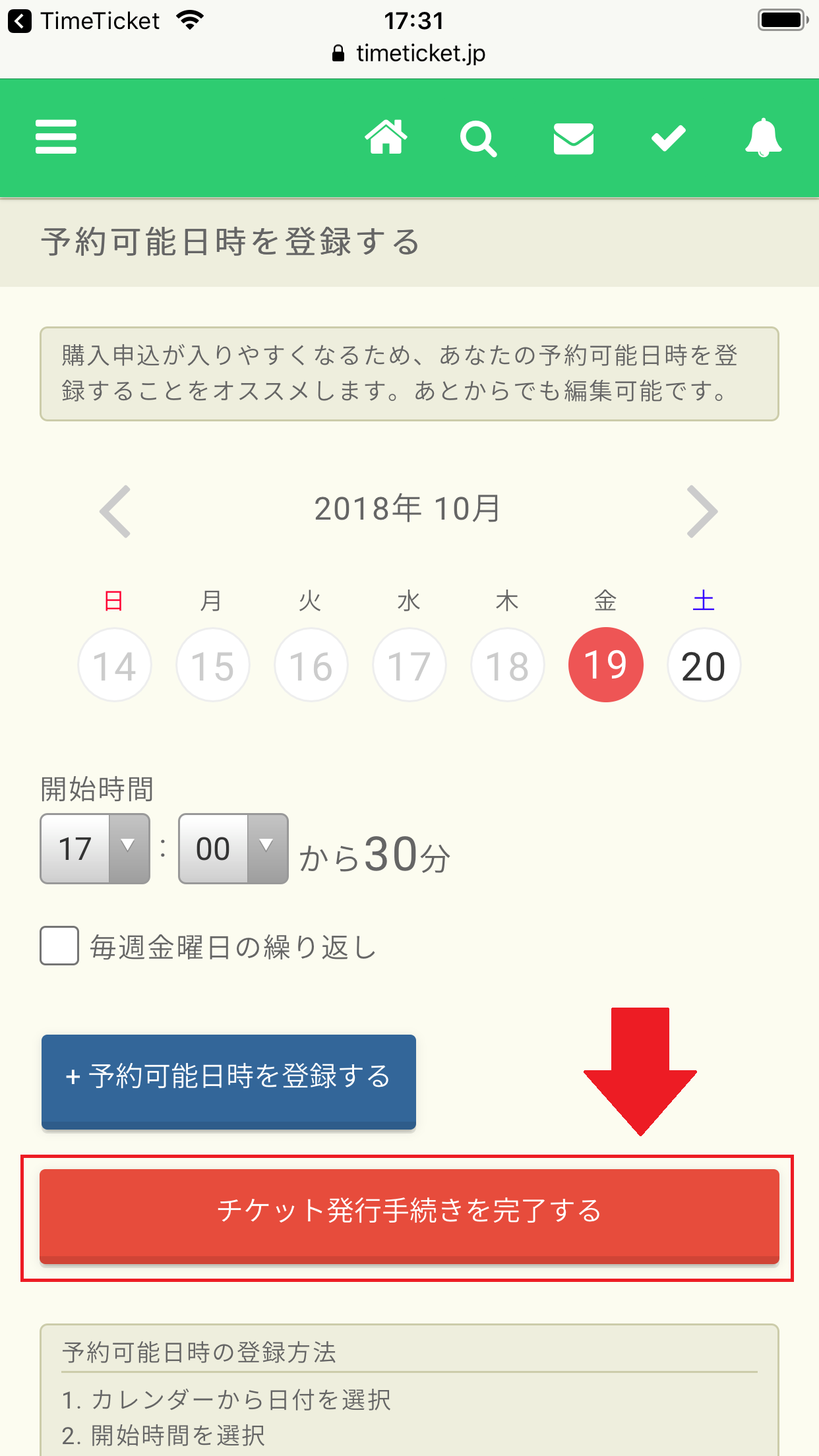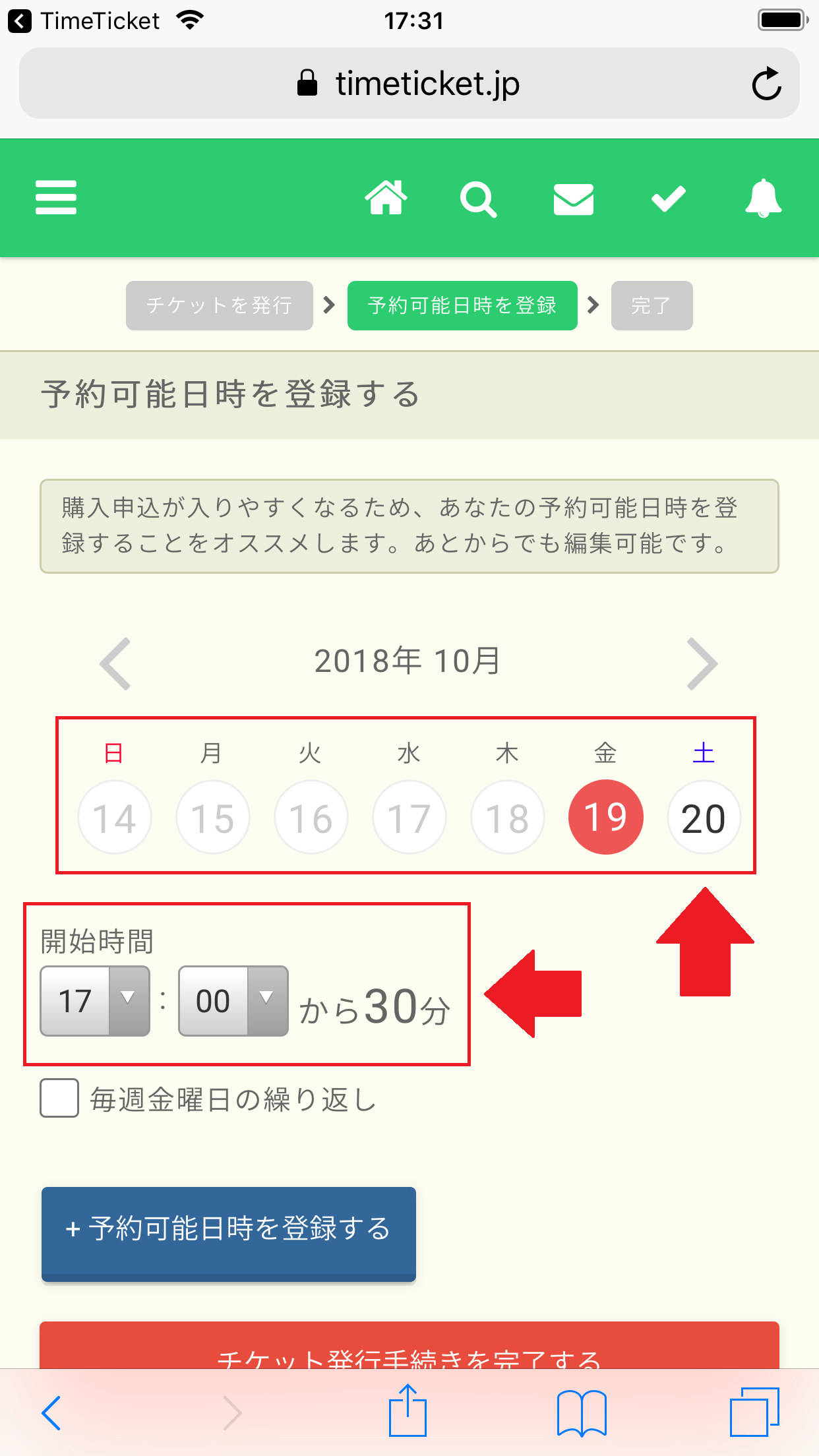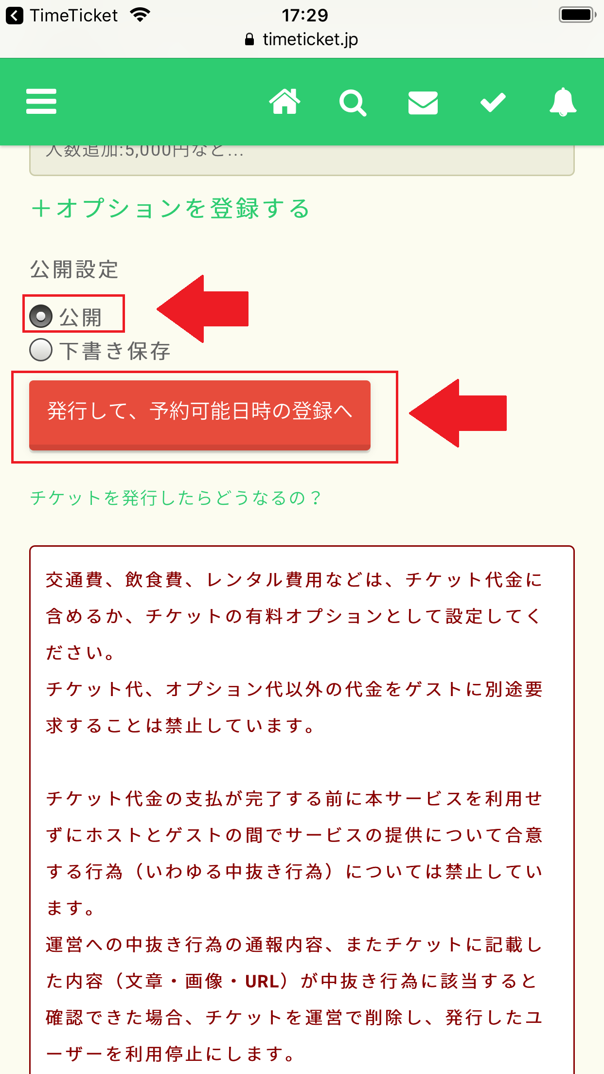 ここまでの入力が終わったら「公開」にチェックを入れ、「発行して予約可能日時の登録へ」をタップします。